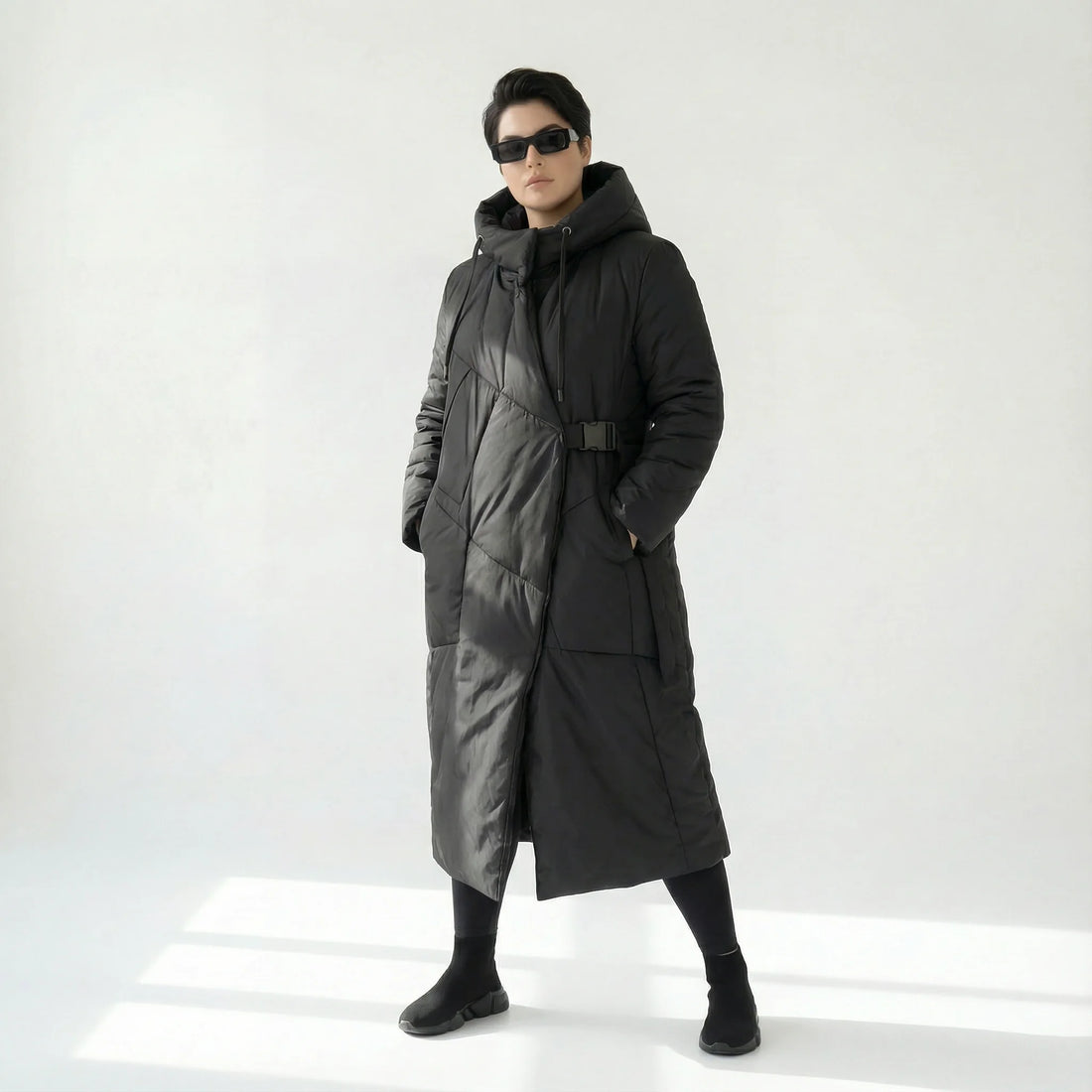 Asymmetrischer Oversize Mantel mit Kapuze und grafischer Steppung in Schwarz
