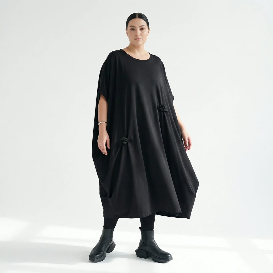 Avantgarde-Kleid in Schwarz mit Drapierung und Blütendetails von Maxlive im Oversize-Look
