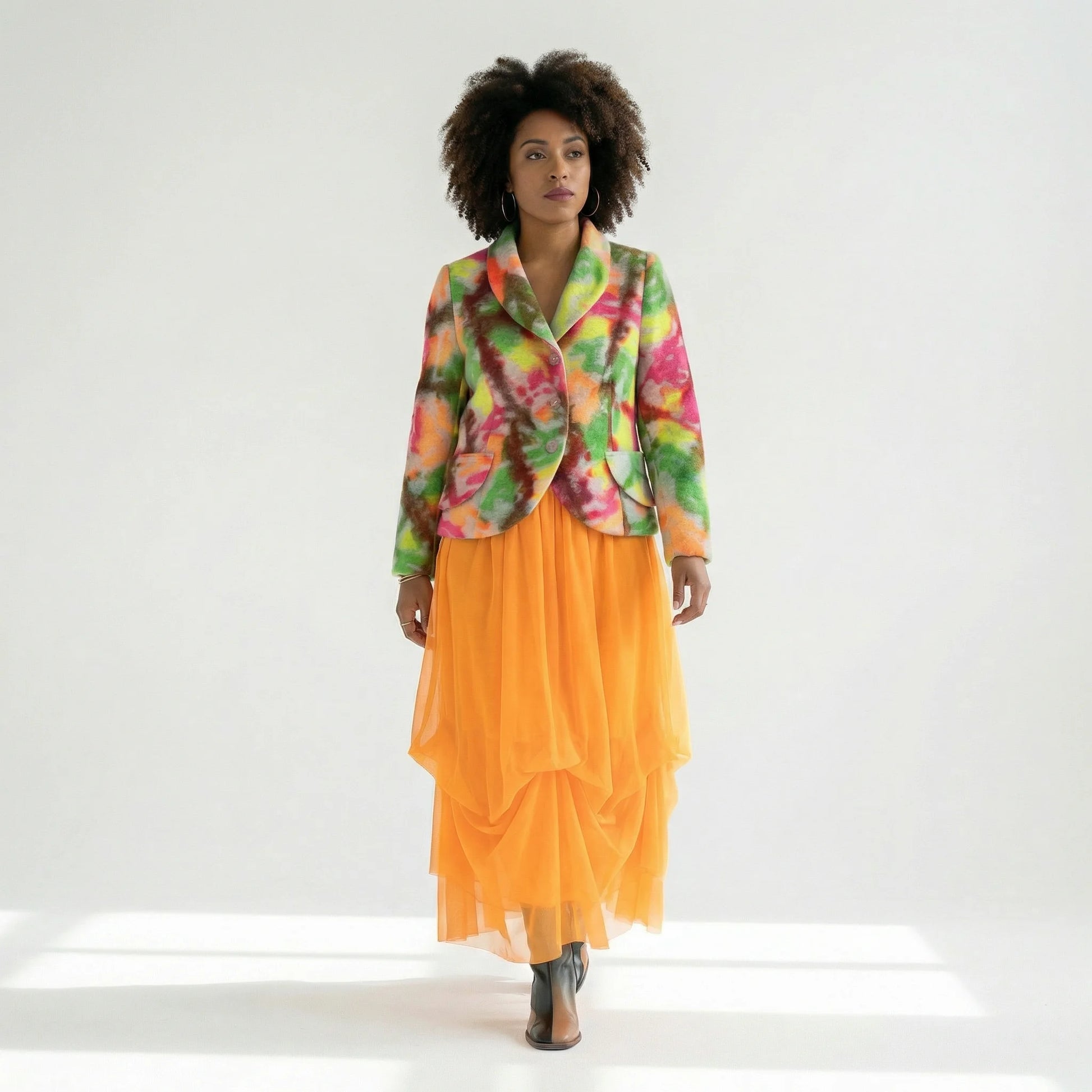 Dieser ausdrucksstarke Wollblazer vereint künstlerischen Farbverlauf mit klarer Silhouette und wird zum stilprägenden Statement im Übergang und Winter. Die hochwertige Designer-Ware aus 100% Wolle überzeugt durch angenehme Wärme, weiches Tragegefühl und eine feminine Passform. Ob als Stilbruch zum fließenden Rock oder als Eyecatcher zur schmalen Hose – dieses Modell bringt Farbe, Charakter und selbstbewusste Eleganz in jede Garderobe.