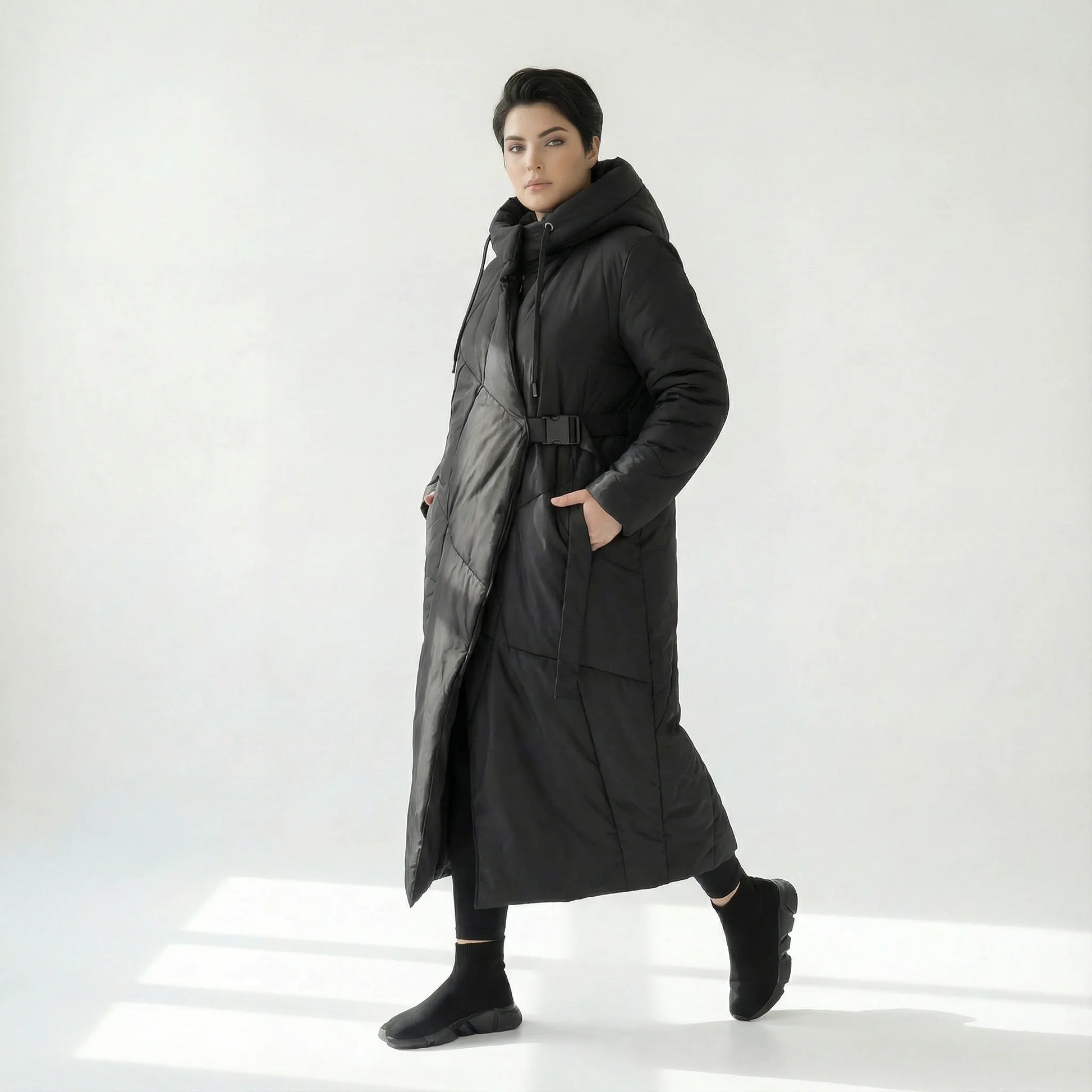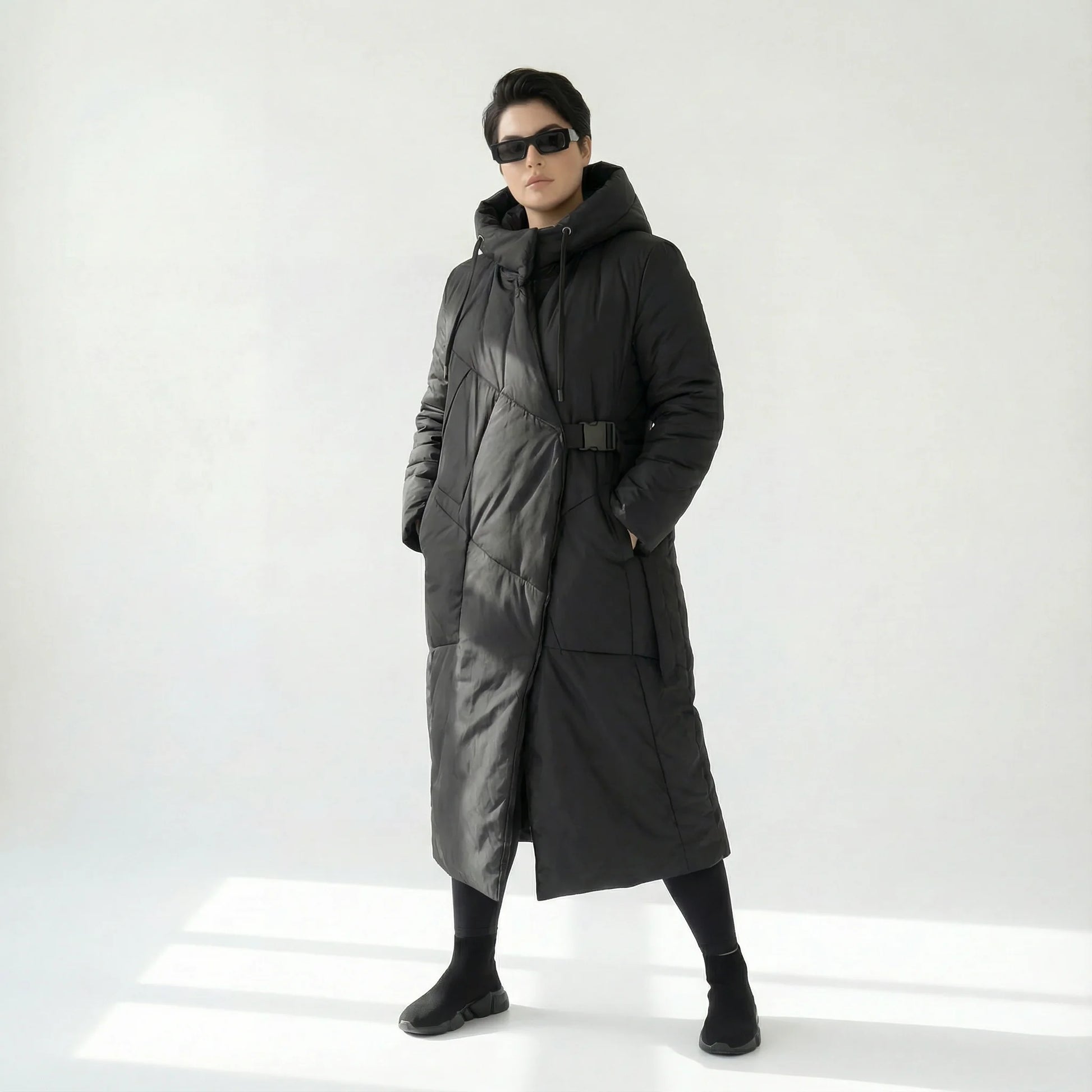 Dieser asymmetrische Mantel vereint avantgardistische Linienführung mit funktionalem Komfort und klarer Ästhetik. Die diagonal verlaufenden Steppnähte erzeugen eine grafisch-abstrakte Optik, die bewusst mit klassischen Mantelformen bricht. Das glatte, weich fließende Material sorgt für angenehme Wärme im Übergang und unterstreicht den modernen Lagenlook. Ein markantes Statement-Piece für Frauen, die Mode als Ausdruck von Individualität und architektonischer Klarheit verstehen.